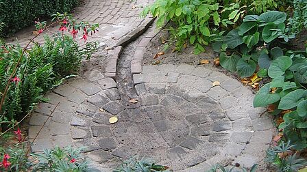 Je ziet hier verschillende manieren waarop je regenwater kunt opvangen, in de bodem kunt laten zakken en dit een mooie plek in je tuin kunt geven.